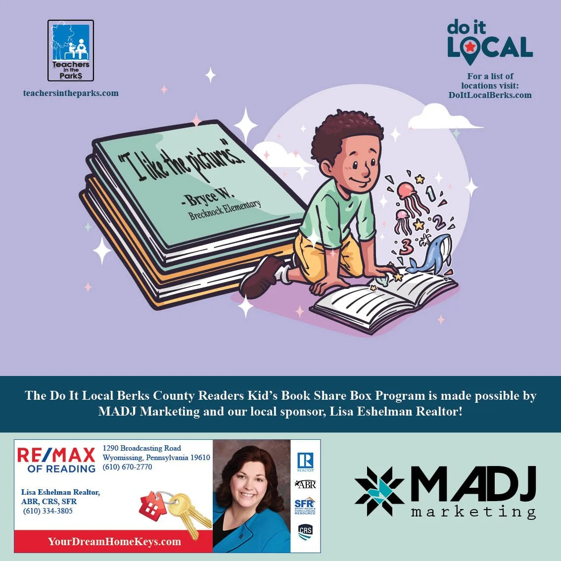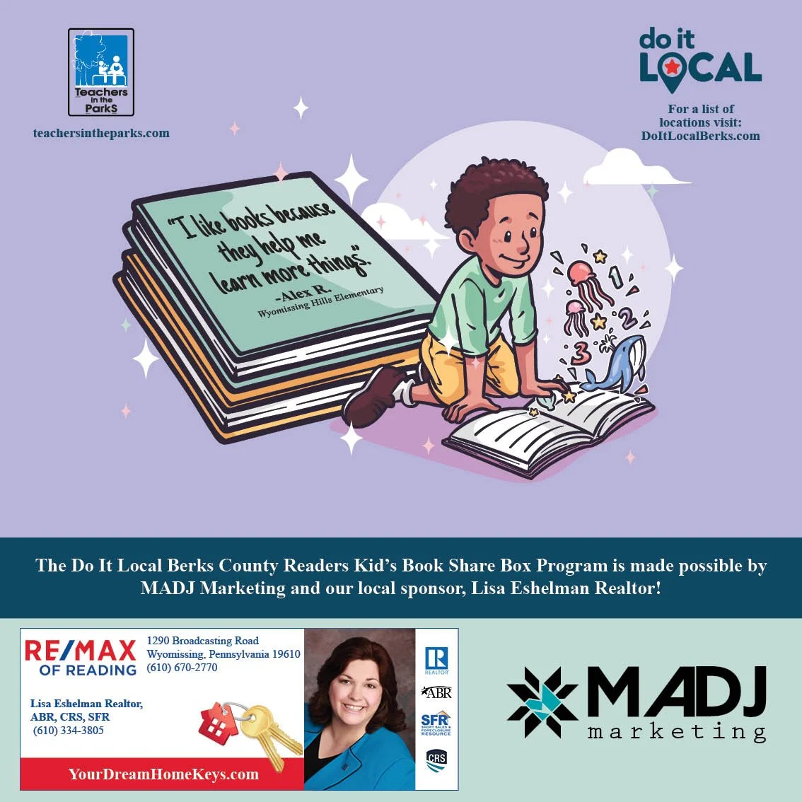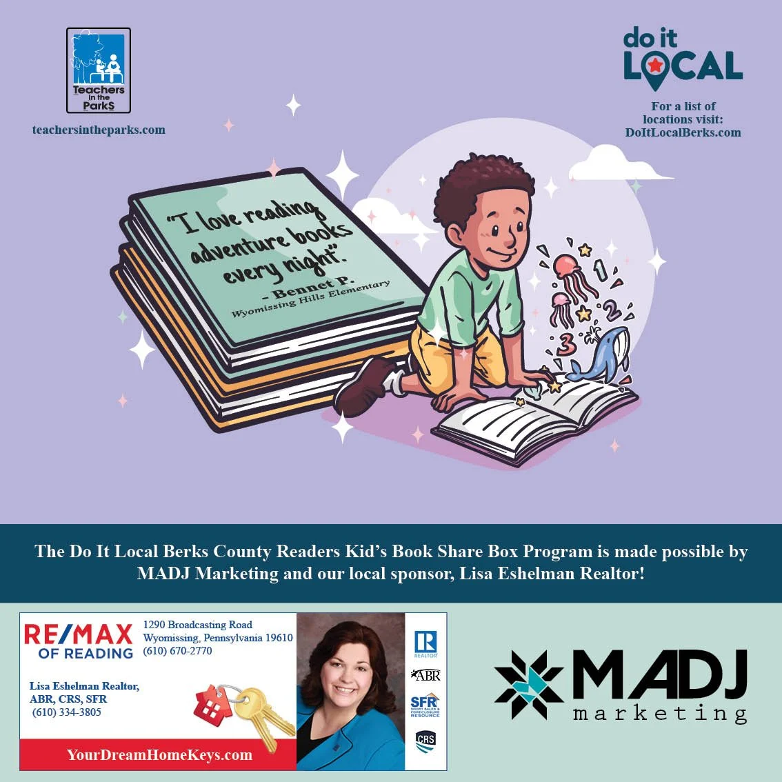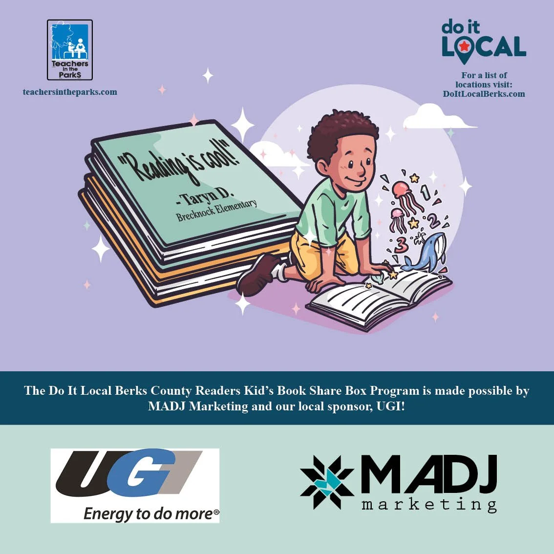 Thanks to our amazing sponsors and donors, we are able to ensure that our local kids have plenty of books to enjoy! You will find our Book Share Boxes in Hamburg, Morgantown, Honey Brook, Antidam, Exeter, Birdsboro, Douglasville, Wyomissing, West Lawn, West Reading, Heidelberg, Reading, Temple, Sinking Spring, and Shillington!