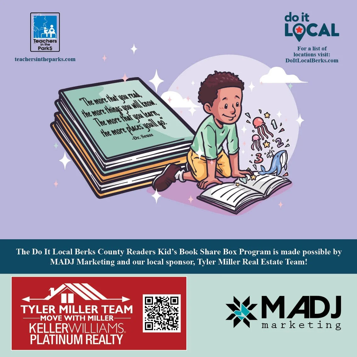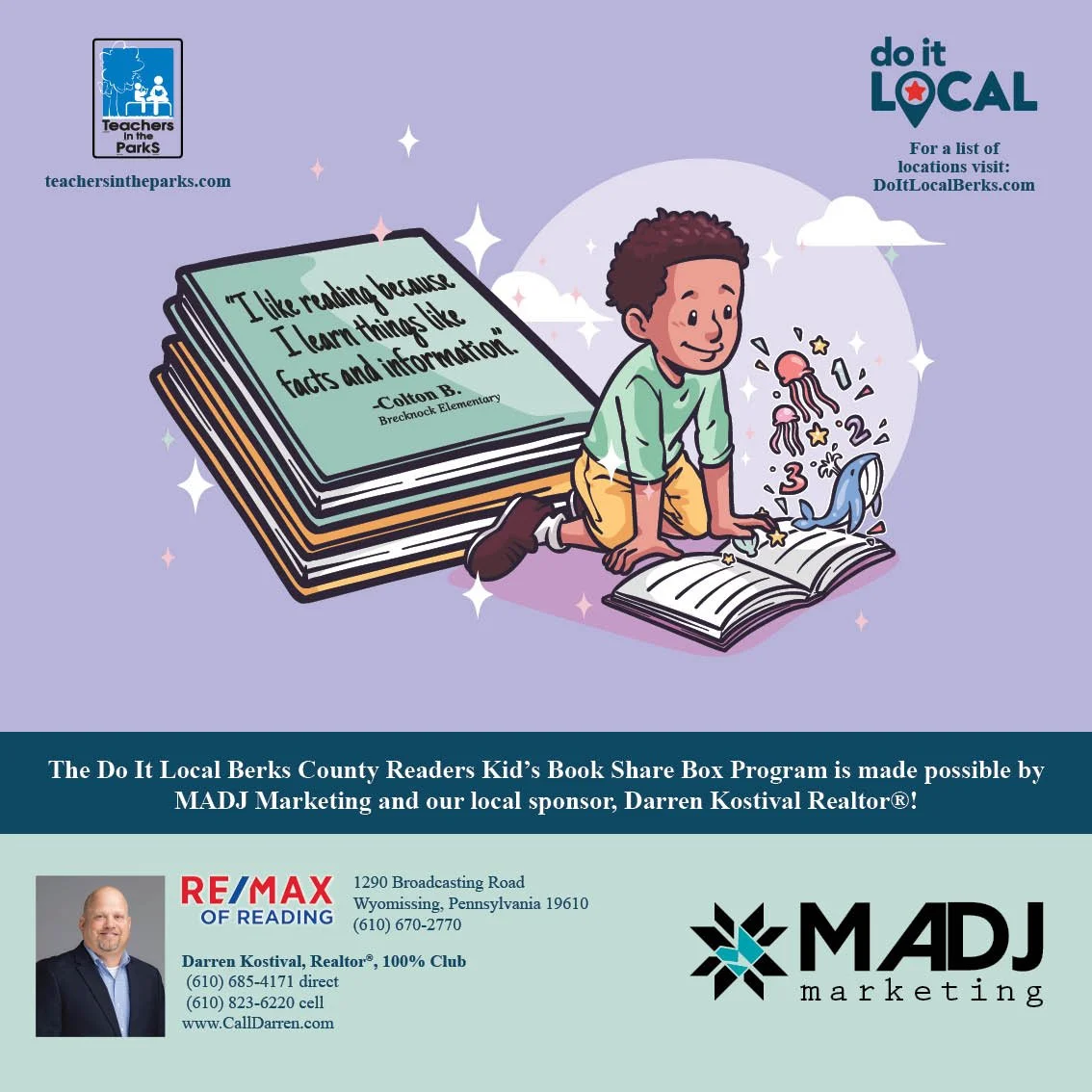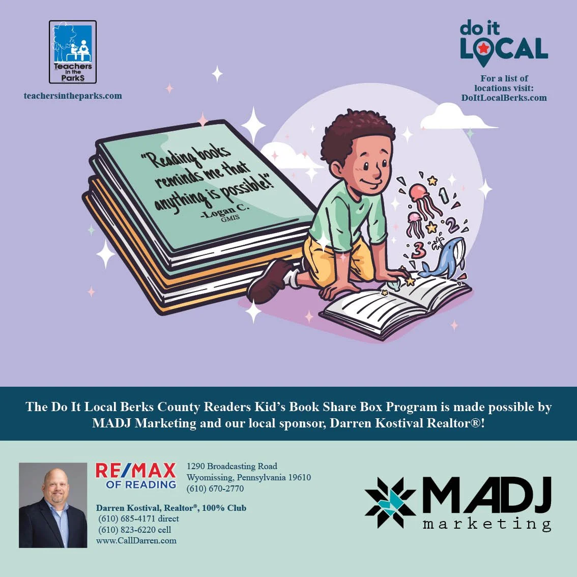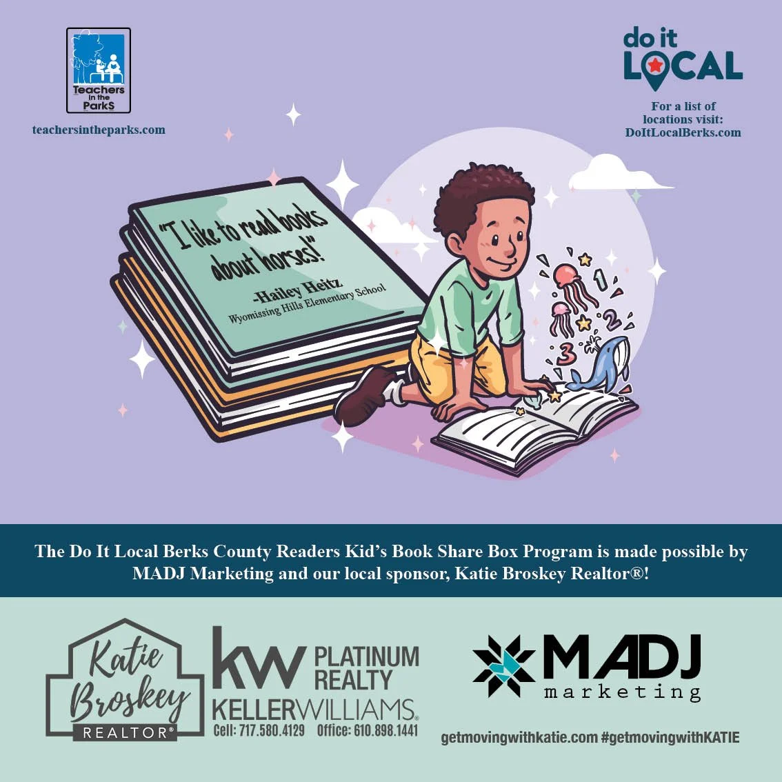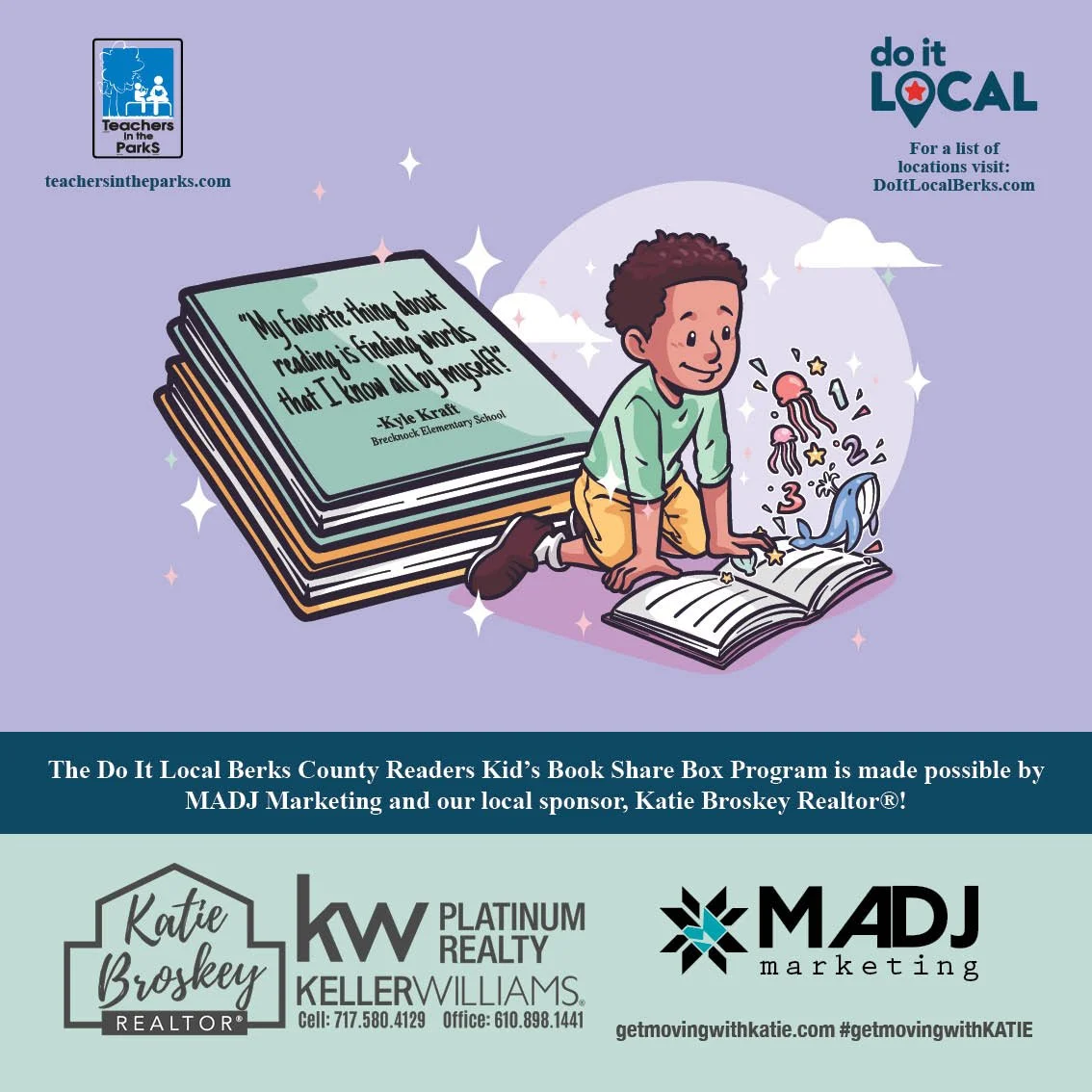 Thanks to our amazing sponsors and donors, we are able to ensure that our local kids have plenty of books to enjoy! You will find our Book Share Boxes in Hamburg, Morgantown, Honey Brook, Antidam, Exeter, Birdsboro, Douglasville, Wyomissing, West Lawn, West Reading, Heidelberg, Reading, Temple, Sinking Spring, and Shillington!